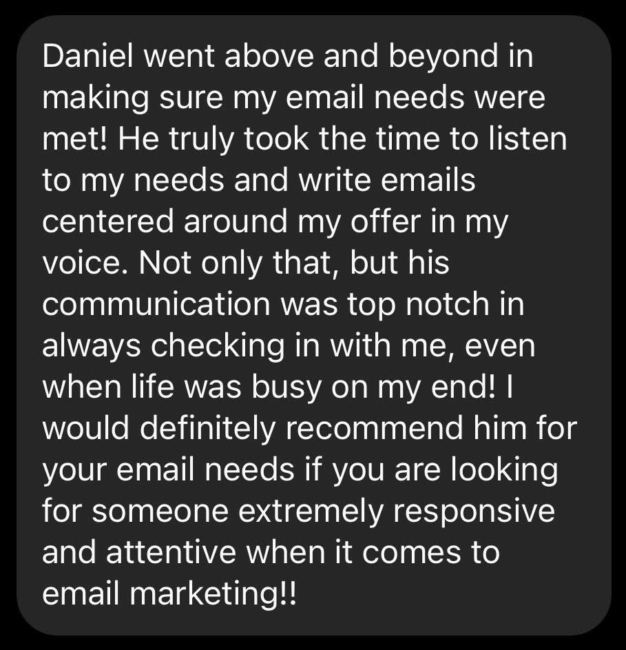 We can create automations like:- Welcome-and warmup sequences✅- Promo sequences✅- Product aware sequences✅- Abandoned cart sequences✅- Abandoned checkout sequences✅- Abandoned application sequences✅- Site abandoned sequences✅- Post purchase sequences✅- Subscriber reviver sequences✅- Subscription renewal sequences✅- Event-building sequences✅- Retargeting sequences✅And more...We'll make sure the segmentation of your email list is flawless,So you're not marketing to the wrong people,And leaving cash on the table.We'll also secure healthy deliverability rates for your list,So that you have a steady flow of leads coming from your emails,Instead of marketing to a dead audience and missing out on hot leads.Last but not least, we're HUGE on split-testing for higher conversions,Because that's where the money lies.PS: You don't need any active email marketing systems already,Like a lead magnet or an email list,Because we can build it from the ground up.And it's worth taking email marketing seriously,Because it has the highest ROI of all marketing,With an average ROI of $40 per $1 invested.