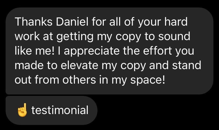 Our vision is for you to have elite level copy and marketing,So you can have a steady flow of leads coming to your services,And monetize those leads effectively.Every month, your copy and marketing should be your #1 source of:- New customers- Engaging customers- And returning customers.(Which all equals to increased revenue)...If you want to see if we're a fit for your business, you can book a call below.Or if you're stressed with too many clients and need to vent your feelings,We can pretend to be your therapist on the call (then we can't help, but at least we'll listen).